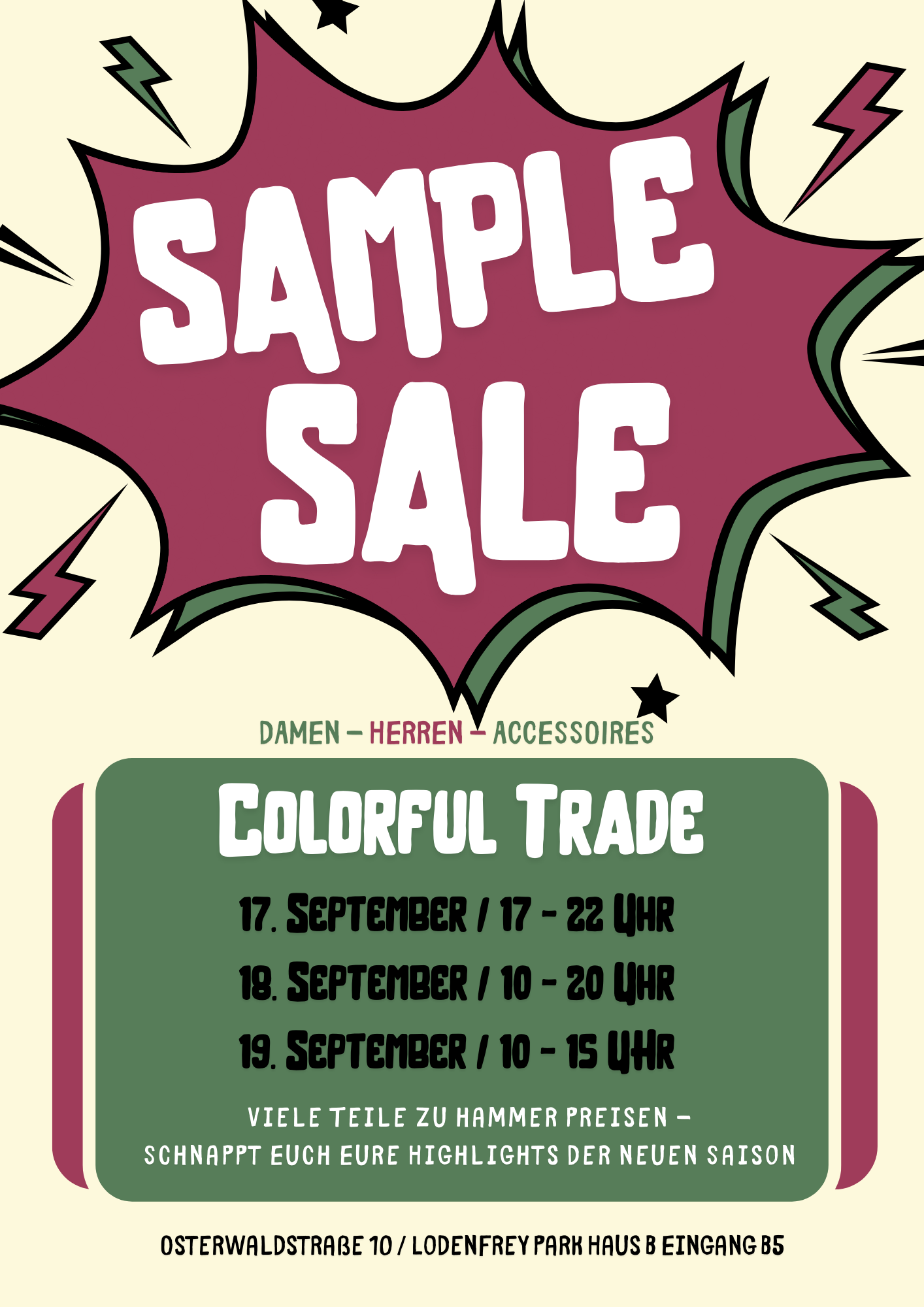 Ihr seid alle herzlich eingeladen bei unserem Sample Sale vom 17.09 – 19.09 vorbei zu schauen!